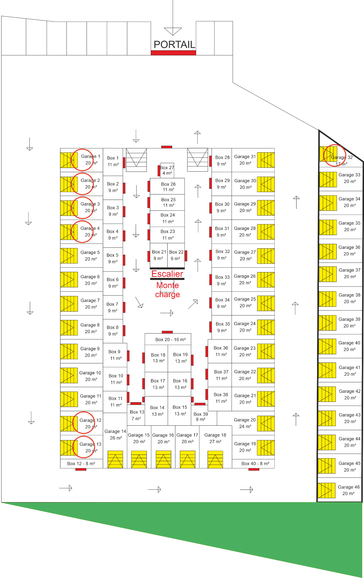 - 46 garages de 17 à 27 m² permettant de garer un véhicule d'une hauteur maximale de 1.90 m
