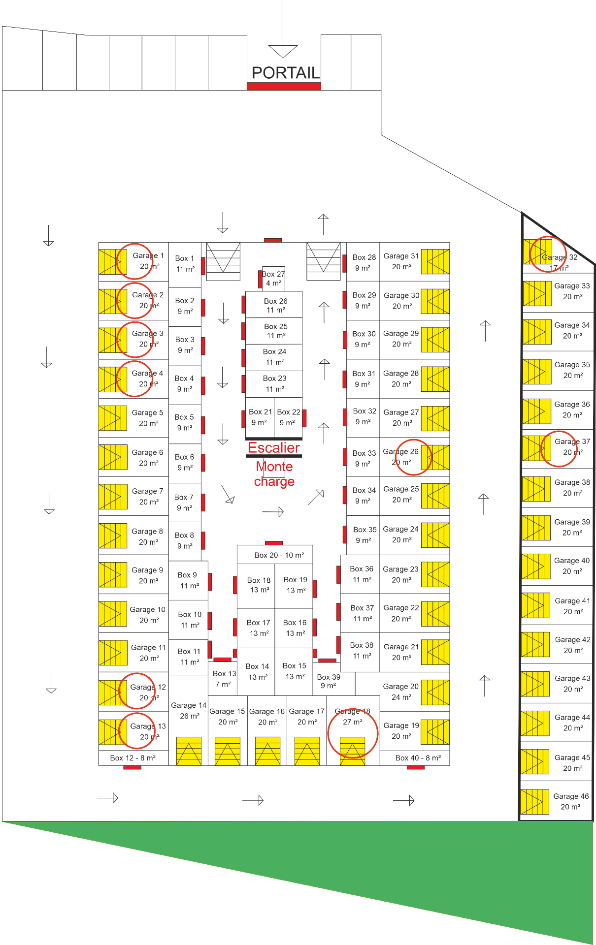 - 46 garages de 17 à 27 m² permettant de garer un véhicule d'une hauteur maximale de 1.90 m